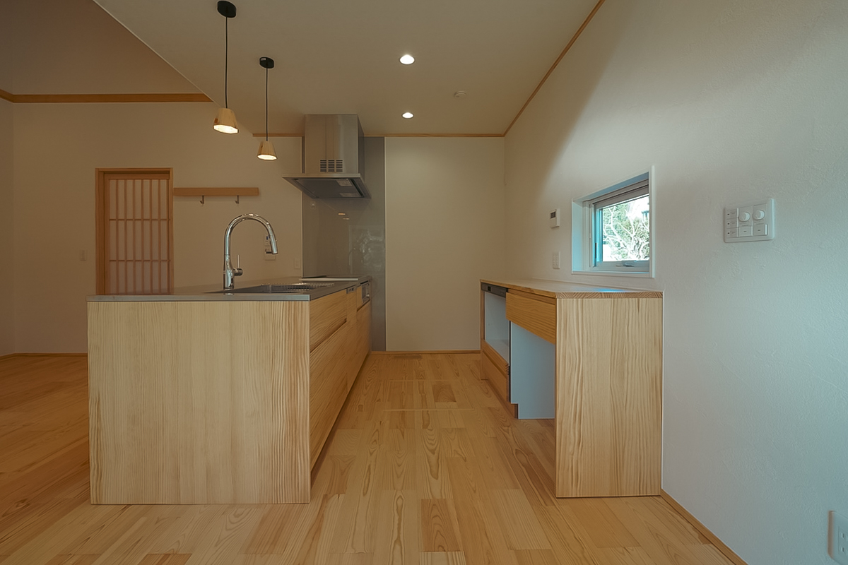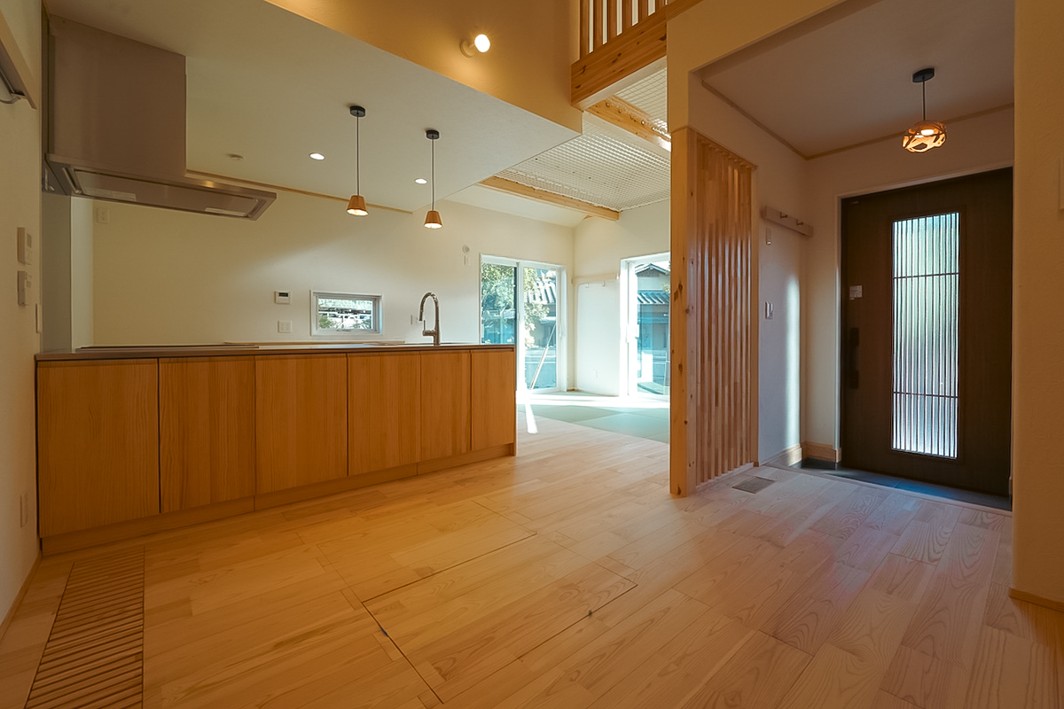 1階全体に床暖房・床冷房を標準装備し、天然木のフローリングや漆喰塗り壁といった自然素材の仕上げで、心地よさと安心に包まれる暮らしを実現しました。