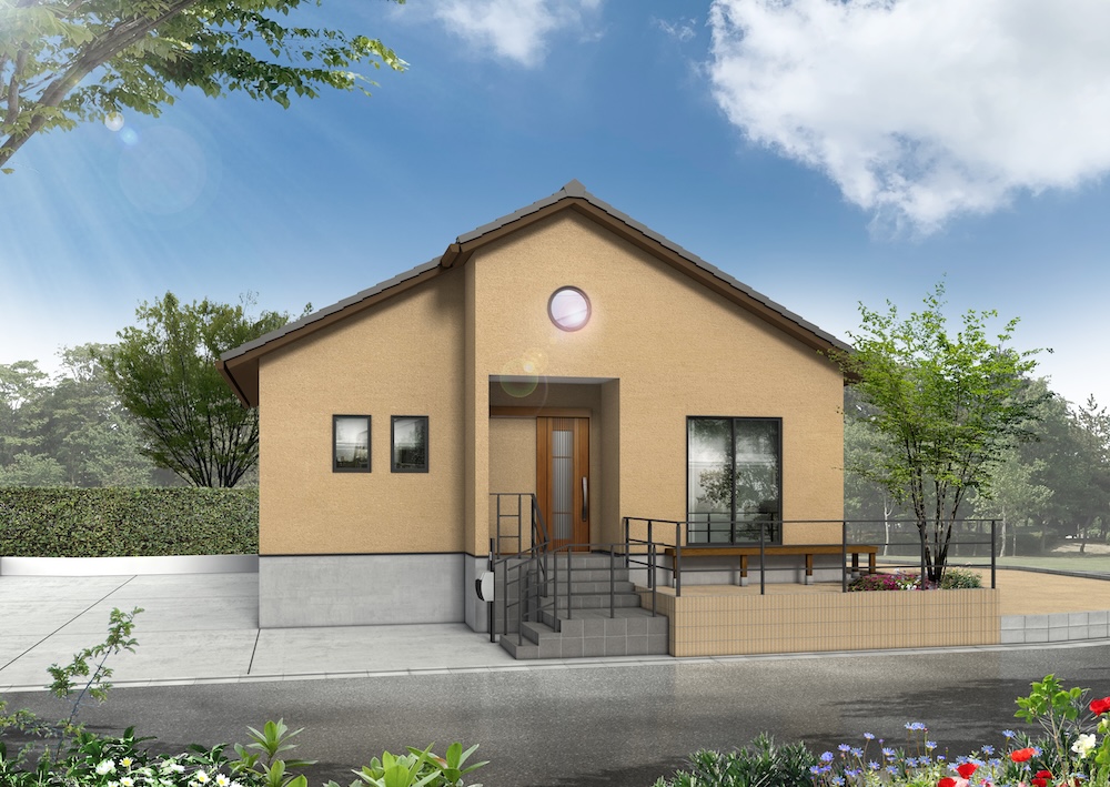 切妻屋根が美しい外観デザインに仕上げられ、さらにロフト部分に設けた丸窓がアクセントとなり、個性を感じさせる佇まいになっています。
